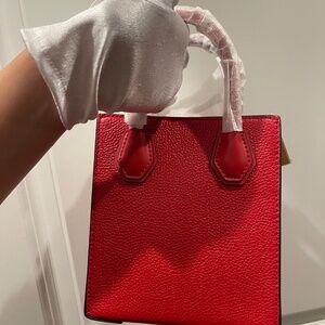 pebbled leather, crossbody, structured bag, leather trim, designer style, compact, red accessory, handbag, functional, new with tags