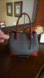 a detachable adjustable shoulder strap. Has a padlock charm and a hanging leather tag. The interior typically includes a center zip compartment, as well as various slip and zip pockets.