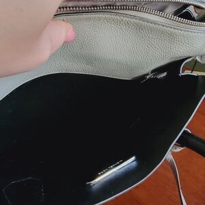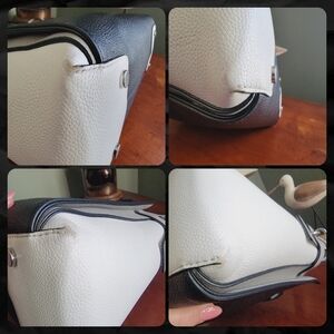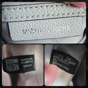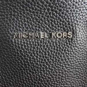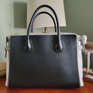 Michael Kors Mercer Large Colorblock Belted Satchel is made of black, white and gray pebbled leather with silver-tone hardware. May be carried with temperature rolled double handles or the longer shoulder/crossbody strap. Top-zip closure. Interior is gray patterned canvas and has a keyring holder, 2 slip pockets, 2 leather zipper trimmed slip pockets, and 1 leather trimmed zipper pocket with leather zipper pull.
