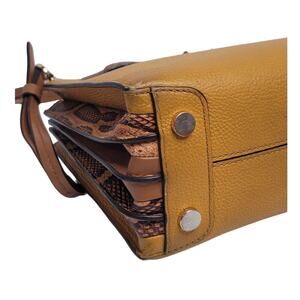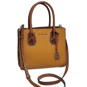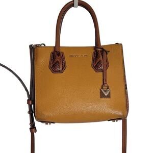 Michael Kors tote from the Mercer collection styled in full-grain pebbled leather with snake-embossed accents, and gold-tone fittings. This tote features 2 main pockets, center zip pocket, back zip pocket, 2 leather handles with a 4.5" drop; adjustable strap with a 22.5"-27" drop. Dimensions: 7.5"W x 8.75"H x 4"D.
