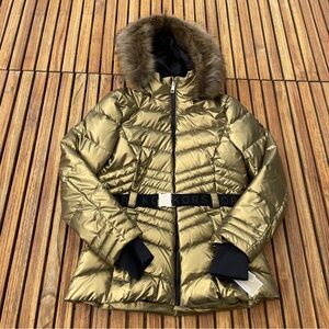 Michael Kors Metallic Gold Quilted Hooded Faux Fur Puffer Coat Size Medium