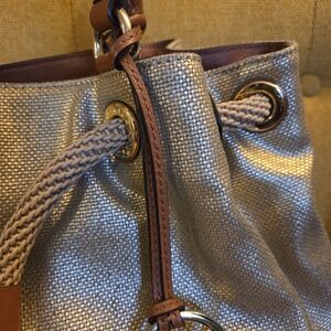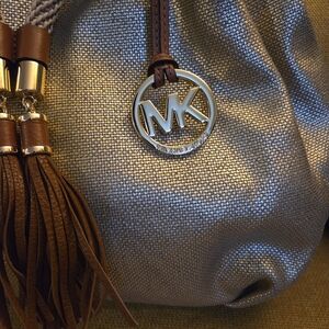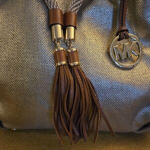 Chic Michael Kors shoulder bag in metallic gold. Features tan leather handles and tassel detail. Perfect for stylish outings.