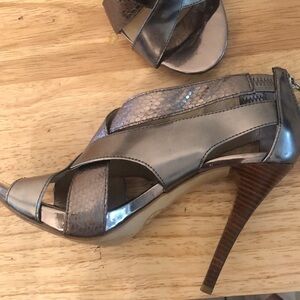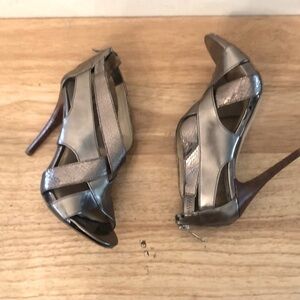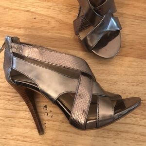 Michael Kors Metallic Heels Size 6. In very good used conditon. Some wear on interior and outer sole as pictured. The color is a dark silver almost holographic looking.