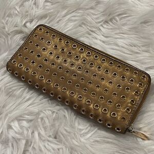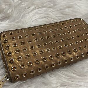 Michael Kors zip around wallet. All over grommet design. Minor wear to corners - missing one metal grommet - pictured. Gently used condition.