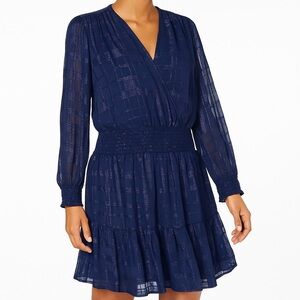 Michael Kors dress in navy metallic plaid fil coupé with faux-wrap V-neck and hidden closure. Long semi-sheer sleeves with smocked cuffs, wide smocked waist, tiered flounce hem. Pullover, lined body. Approx length 38”. Elegant yet versatile for work, dinner, or party wear. No flaws.