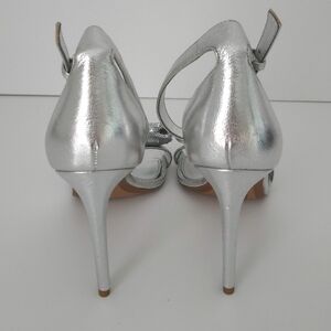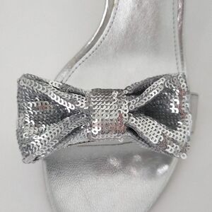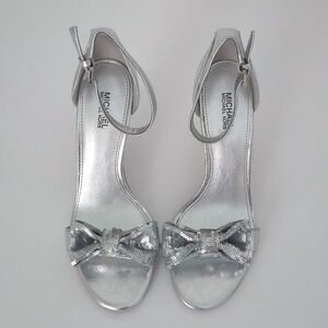 Michael Kors Metallic Silver Sequin Bow Ankle Strap Open-Toe Stiletto High Heels