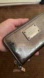 Chic metallic wristlet by Michael Kors. Embossed logo pattern. Convenient wrist strap. Never used. Might have a smudge or two just from storage. A wipe down now and then will keep shiny. No dusty or box. Authentic tag in last pic. 3 card slots. Bill and paper storage no change part.