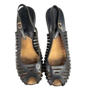 Step into timeless elegance with these vintage-inspired slingback heels. The rich, black leather upper features a stunning, intricately woven caged design that exudes sophistication and style. A classic peep-toe silhouette and adjustable ankle strap with a delicate gold-tone buckle ensure a secure and comfortable fit. The chunky, stacked wooden heel provides both a chic lift and stable footing, making these shoes perfect for any occasion, from a day at the office to a night on the town. Whether paired with tailored trousers or a flowy dress, these heels are a versatile and captivating addition to any wardrobe.
