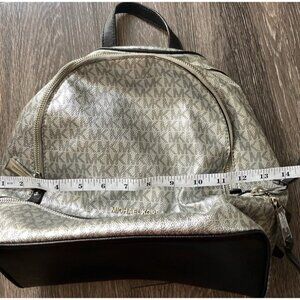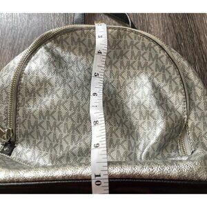The Michael Kors Mini Backpack in MK Signature is a stylish and versatile accessory for women. Made from leather in a metallic silver color with signature accents, this medium-sized backpack features adjustable black leather straps and silver hardware. Ideal for travel, casual outings, or workwear, this trendy backpack also includes a wristlet accessory and a pebbled finish for a chic look. With the iconic Michael Kors branding and classic design, this backpack is a must-have for any fashion-forward woman.