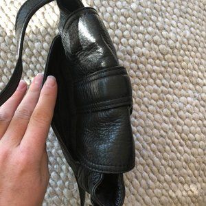 Soft Black leather, gold hardware and flap buckle closure. About 8x6x2 in with a 26 in long adjustable strap. Back slip pocket on the back for easy access of cards (pictured). Preloved in great condition. Great for going out and needing only the essentials - phone, card, keys, etc.!