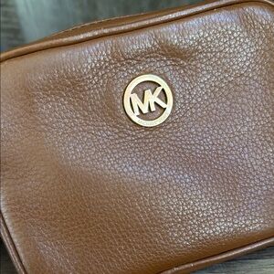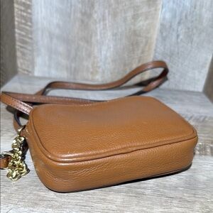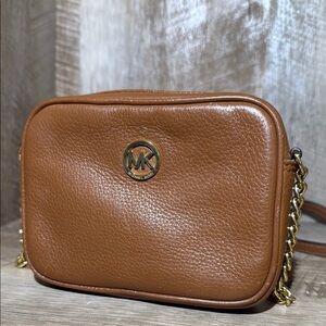 This Michael Kors crossbody bag in a rich brown hue features a pebbled leather texture and a gold chain strap detail. Its compact, boxy shape offers a minimalist design, making it a versatile accessory for any occasion.