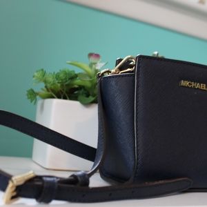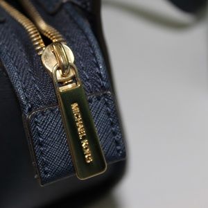 Cream/tan interior, with dark navy blue compartments for cards/cash