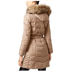 This Michael Kors Missy Quilted Midi Down Jacket combines functionality and style, offering warmth and elegance with its quilted design and detachable fur-trimmed hood. The belted waist provides a tailored fit, while the gold-tone hardware adds a touch of sophistication. Ideal for chilly weather, this jacket is a practical addition to any wardrobe.