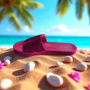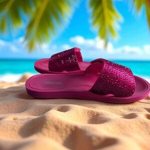 Vibrant pink sandals with sparkling embellishments. Features iconic MK logo. Perfect for casual outings.