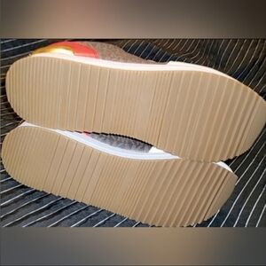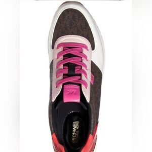 Worn twice maybe. Size 8 but can fit youth size 6.5 so I'm posting them as such. Michael Kors lace up trainers with monogram browns and some pink/shade happenings.
