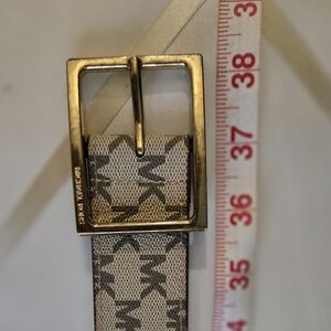 Stylish Michael Kors belt featuring a monogram design. Accented with a gold buckle.