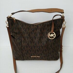 Michael Kors Monogram Brown Shoulder and Cross-body Bag Condition: Pre-owned Bag Width: 13 in, Closure: Zip, Handle/Strap Color: Brown Occasion: Casual, Travel, Office. Size: Large, Color Brown Hardware Color: Gold, Accents: Zipper, Logo, Detachable Strap 13” L 12” H x 4.5” W Strap Drop: 8" and detachable adjustable 20" Department: Women, Exterior Color: Monogram Brown Style: Shoulder and Cross-body, Features: Adjustable Strap, Convertible, Detachable Strap Finish: Coated, Pattern: Logo Character: Michael, Lining Material: Canvas Exterior Material: Leather Brand: Michael Kors, Lining Color: Brown Theme: Designer, Logo, Handle/Strap Material: Leather Character Family: Charmed