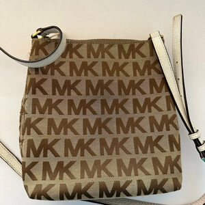 Michael Kors Monogram Drawstring Bucket Brown Mini Crossbody Bag.