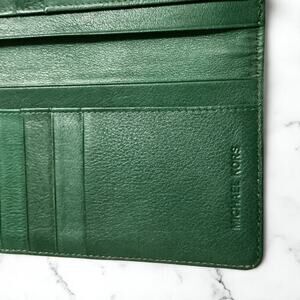 Preowned Michael Kors wallet in excellent condition — no rips, holes, stains, or flaws. Interior looks clean and well-kept. Features the iconic MK monogram canvas with green leather trim, silver hardware logo plate, multiple card slots, ID window, and zip coin pocket.