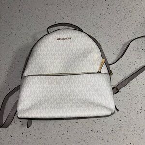 Elegant white leather backpack with MK pattern. Gold-tone logo accent.