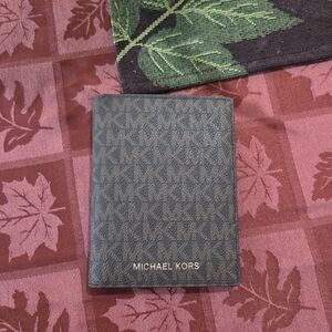 Monogram Michael Kors Passport holder with signature monogram design. Features a sleek Brown and Tan color scheme.