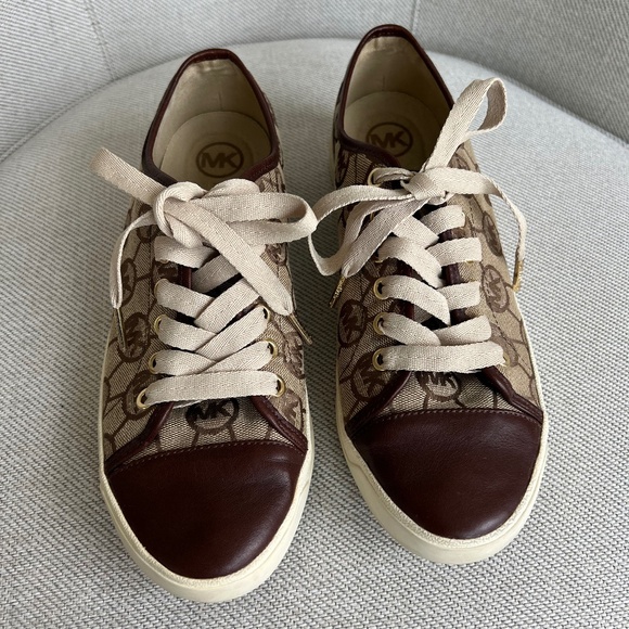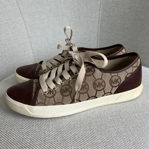 Michael Kors Monogram Sneaker with canvas / leather material and gold details on laces. Excellent condition with minimal signs of wear. Size 8.5.