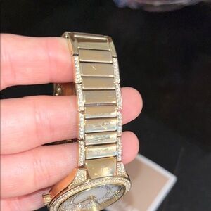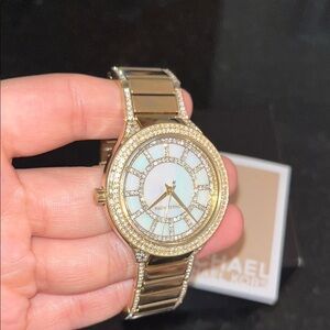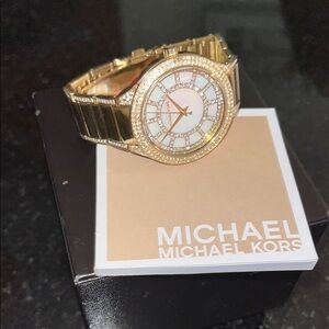 Michael Kors stylish women’s gold watch with a mother of pearl face. Adorned with crystals and a white dial.