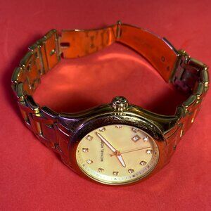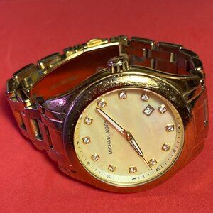 Michael Kors Mother of Pearl Ladies Watch: MK5310. Gold tone stainless steel case and bracelet. There are small scratches on the bezel. Champagne mother of pearl dial with luminous gold-tone hands and crystal hour markers. Minute markers around the inner bezel. Luminescent hands. Date display between the 4 and 5 o'clock positions. Quartz movement. Scratch resistant mineral crystal. Texturose gold-tone crown. Case diameter: 40 mm. Fold over clasp with push button release. Water resistant at 100 meters / 330 feet. Functions: hours, minutes, seconds, calender. Fitts up to 6 1/2 inches. There are no extra links.