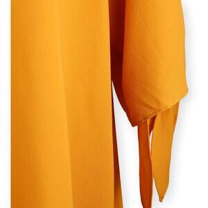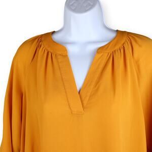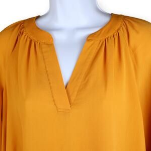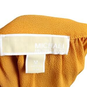 Michael Kors Mustard Yellow Womens Blouse M. Split neck, tie cuff, 3/4 sleeve, gathered blouson look. EUC. 98% polyester, 2% elastane/spandex.