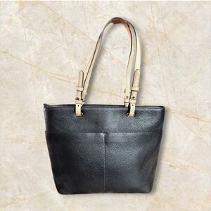 Black leather shoulder bag with 4 large exterior slide pockets. Lt tan leather, adjustable handles. Black silky interior with large zip pocket and inside slide pocket.
