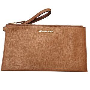 Michael Kors Jet Set Travel Pebbled Leather Large Top Zip Wristlet Zip Closure Michael Kors Logo At Front Gold Toned Hardware Custom Fabric Lining 1 Slip-in Pocket 9.5" (L) x 5.5"(H) x 0.5"(D) Strap: 6.5"