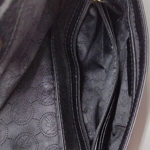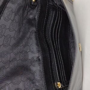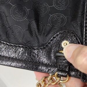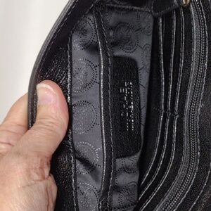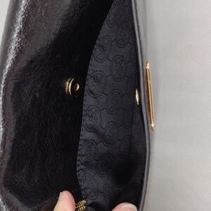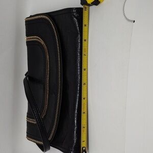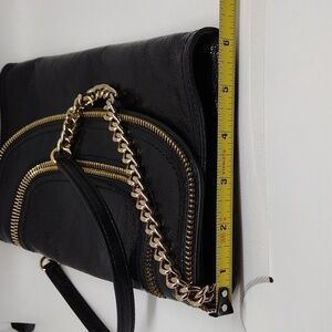 Great pre-owned condition beautiful black leather clutch with gold chain strap and hardware. The bag has a magnetic closure, decorative zippered detailed flap, back button snap pocket, detachable chain strap, 6 interior card slots, 1 interior zippered pocket, and 1 interior slip pocket. See the last 3 pics for measurements.
