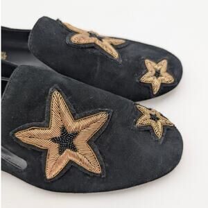 These stylish Michael Kors Natasha suede loafers. The black suede features embroidered gold star appliques that add a touch of glamour to any outfit. The slip-on design with almond toe shape and comfortable M width make them a perfect fit for casual occasions, workwear, or even travel.