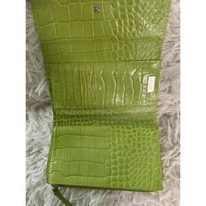 Apple green tri-fold wallet with zipper pockets inside and back. Paper money, coin pocket and lots of card slots. Branding on accents closure tab.
