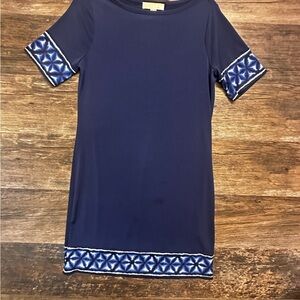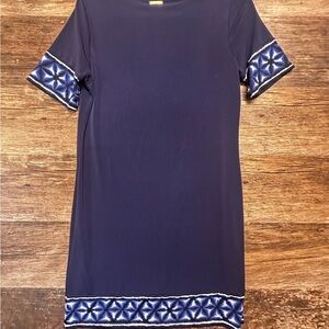 Elegant navy blue dress. Features geometric trim on sleeves and hem. Perfect for any occasion.