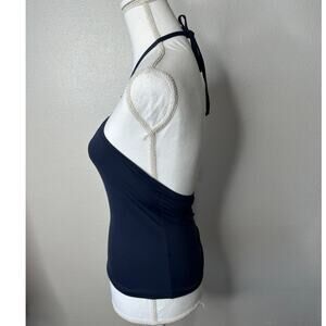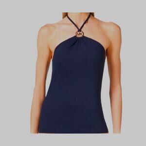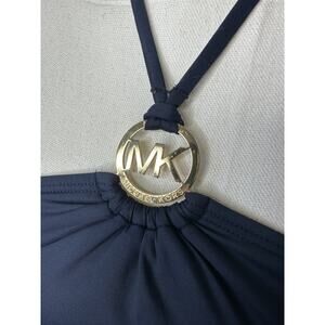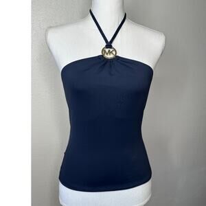 Chic Michael Kors navy halter tankini swim top in size XS with signature gold MK logo ring at the neckline. Features a built-in shelf bra for light support (unpadded) and an adjustable tie-neck halter strap for a flattering fit. Fully lined with stretch swimwear fabric.