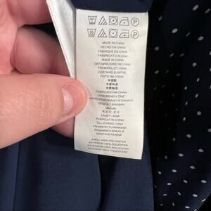 Michael Kors Navy Blue Polka Dot Cold Shoulder Dress in women’s Size Medium. Long sleeves. Elastic band at waist measures approx 14.75 in across when laid flat and unstretched, length from top of front shoulder to bottom hem measures approx 35.75 in, and pit to pit measures approx 20 in across. Ties at keyhole neckline. Dress is lined and in very good used condition with no flaws or stains and minimal wash wear. Please see close-up pictures for condition details. Church. Funeral. Office. Career wear. Business. Wedding shower. Shower guest.