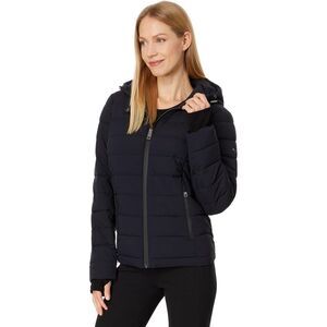 Zip up your style. The MICHAEL Michael Kors® Zip Front Short Stretch offers a flattering fit, comfortable stretch, and convenient pockets. Designed for effortless layering, it features a zippered front closure and long sleeves with thumbholes for added comfort and sleek style. The attached hoodie with drawstring and storm cuff offer extra warmth, while the hand zippered pockets keep essentials secure.