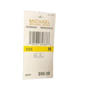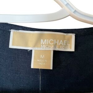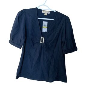 New with tags Michael Michael Kors blouse in a deep navy color. Features a V-neckline with a chic gold buckle accent at the bust, puff sleeves, and a flattering tailored fit. Made from a breathable blend of 55% linen and 45% viscose. Size Medium. MSRP $98