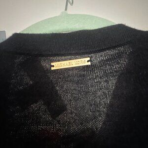 Michael Kors open-front cardigan in navy blue. Draping front panels with orange detailing. Size Small. 58% Cotton, 42% Viscose.