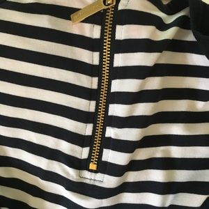 Soft, comfy and stylish, Michael Kors long sleeve shirt with back zipper and stylish gold MK logo on bottom of shirt. Navy blue and white. NWT. Size Small. Would look great with tighter jeans or leggings- longer fit hugs the behind;)