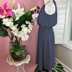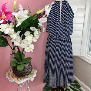 Michael Kors Navy White Stripe Keyhole Halter Midi Dress