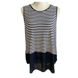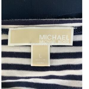 Michael Kors Navy and White Striped Sleeveless Top in size Large is a perfect blend of classic style and casual elegance. Featuring bold horizontal stripes in navy and white, this sleeveless top offers a timeless nautical-inspired look. The soft, breathable fabric and relaxed fit make it comfortable for all-day wear, while the subtle scoop neckline adds a flattering touch. Ideal for pairing with jeans, shorts, or skirts, this versatile piece is perfect for anything from a day at the beach to a casual lunch outing, effortlessly combining comfort and style.