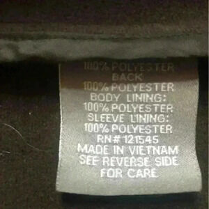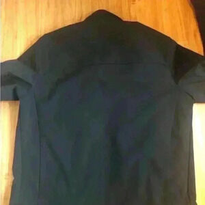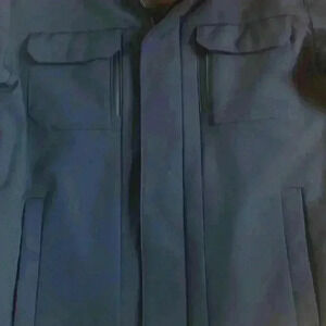 Navy jacket zips and snaps and pockets zip. Navy color. Jacket is still stiff from being unworn. Feels like it may be water resistant??? Lined. All fabric feels amazing.