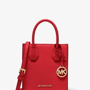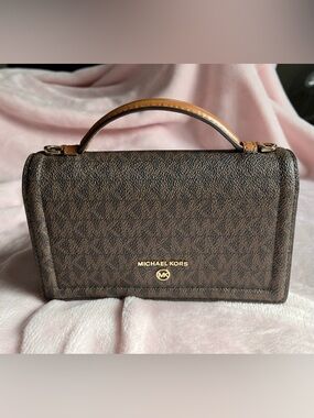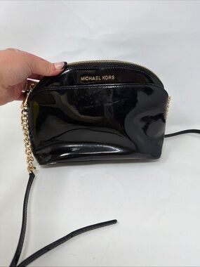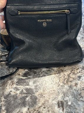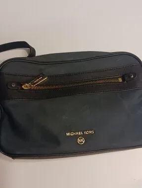 Compact crossbody with navy body and black trim. Front zip pocket with gold-tone hardware. Adjustable black strap for hands-free wear. Polished Michael Kors logo on front.