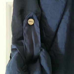 Loose fitting (could easily be a small) and lightweight (polyester). Buttons stop halfway. Roll up sleeves. The length is longer than most shirts and falls past hips. Gently worn only a handful of times.