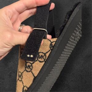 These Michael Kors Noa slippers in a size 8 are the perfect blend of style and comfort. The iconic "MK" logo jacquard pattern adds a touch of luxury, while the soft lining keeps your feet cozy. The adjustable strap ensures a secure fit, and the durable sole allows you to wear them both indoors and outdoors