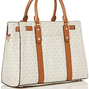 The Michael Kors Nouveau Hamilton handbag is a luxurious top handle bag made from leather, perfect for any woman looking to make a statement. This stylish handbag comes with a matching wallet and dust bag, making it a complete set that is both practical and chic. The Michael Kors brand ensures high quality and timeless style, making this handbag a must-have accessory for any fashion-forward individual.