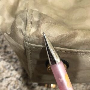 Overall good condition. There is some discoloring along the bottom edges and inside on the lining. Zipper closure, padded interior pocket, and built in key fob strap.