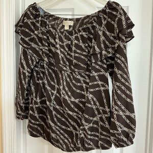 Michael Kors, off the shoulder top with ruffle, brown and white, 3/4 length sleeves with elastic in size medium. Looks great for work or play! 100% polyester, machine wash.
